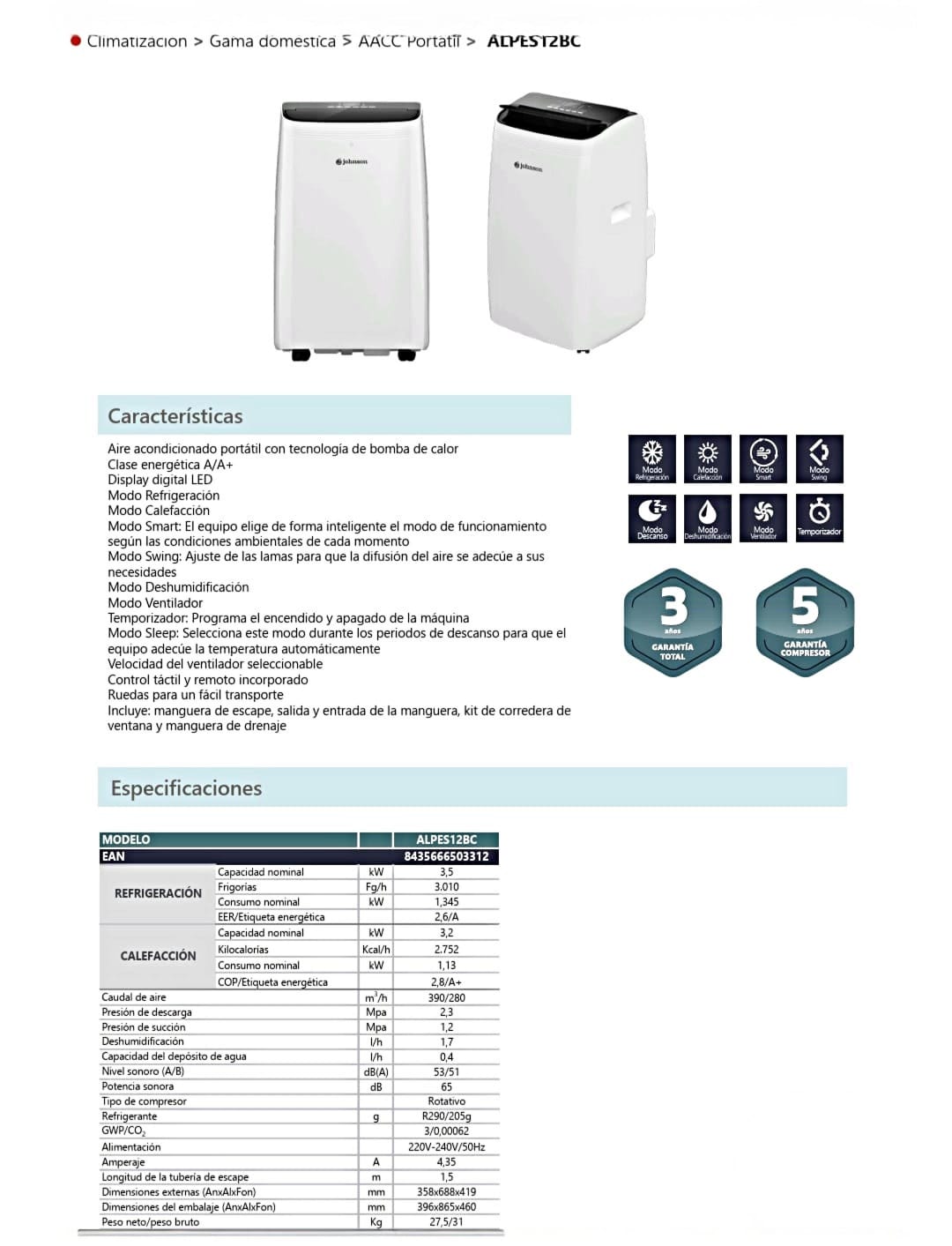 AIRE ACONDICIONADO PORTÁTIL JOHNSON ALPES12BC | BOMBA DE CALOR A/A+