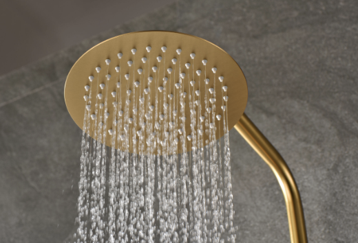 Rociador de acero inox. S.304 Ø20cm, extraplano, acabado oro cepillado y antical. Soporte mango de ducha regulable en altura.