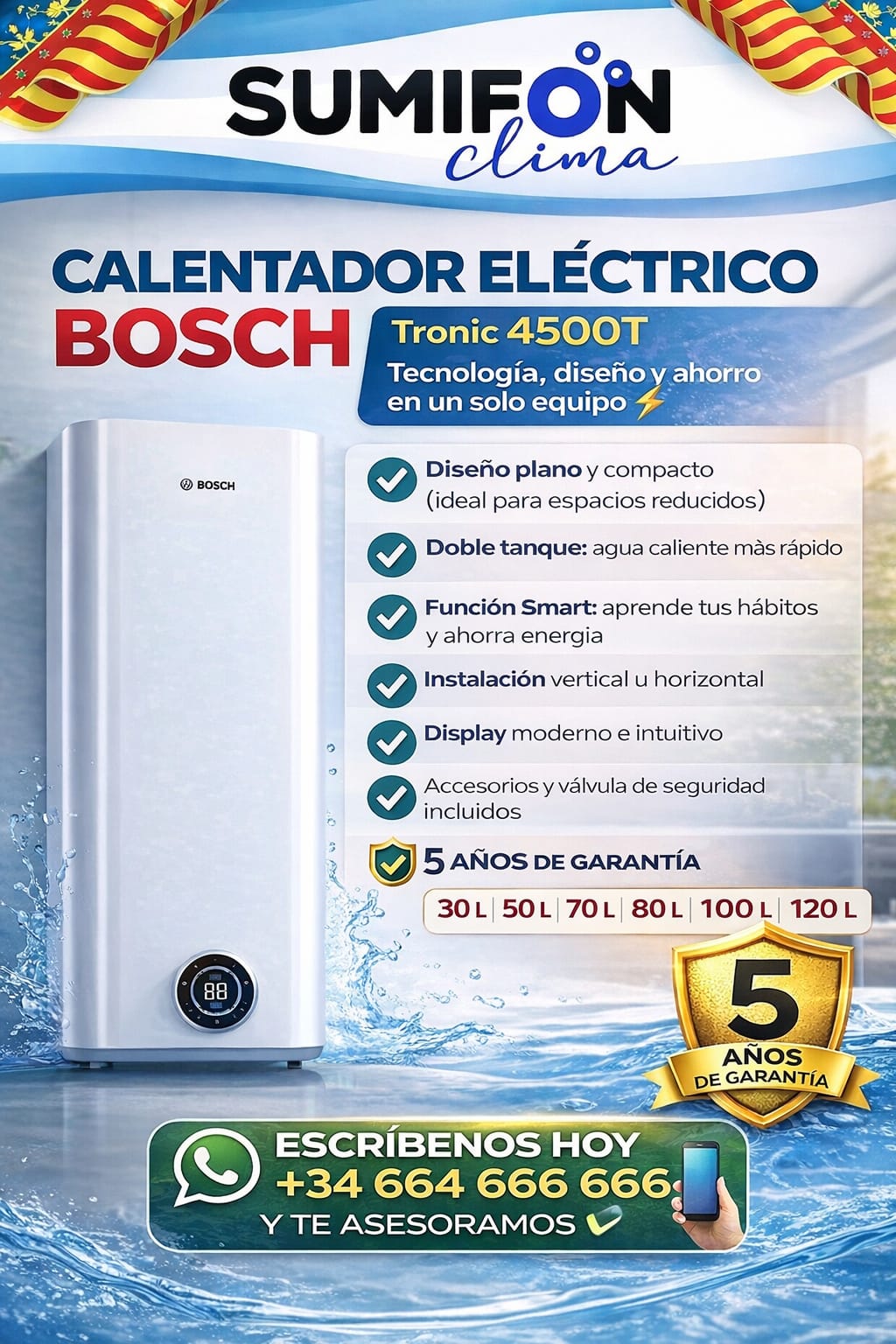• Termos eléctricos planos Bosch Gama Tronic  4501 T Los termos eléctricos planos marca Bosch llegan para revolucionar el reemplazo de antiguos termos. Una solución compacta y moderna en el diseño. Cuentan con display digital de fácil manejo. Ofrecen excelentes cualidades, así como funciones inteligentes para la optimización en la preparación del agua caliente sanitaria, como la función Smart de reconocimiento de hábitos de consumo y la tecnología de doble tanque que reduce el tiempo de espera para disponer de agua caliente, aportando así significativos ahorros energéticos. En cuanto a la instalación, destaca la versatilidad de estos modelos Bosch que pueden ser instalados, en vertical, horizontal e incluso dentro de armarios, gracias a su característico diseño plano compacto y a su display orientable. El modelo de 70 L representa la mejor relación tamaño-capacidad del mercado por sus dimensiones, pudiendo ser instalado dentro de un armario.