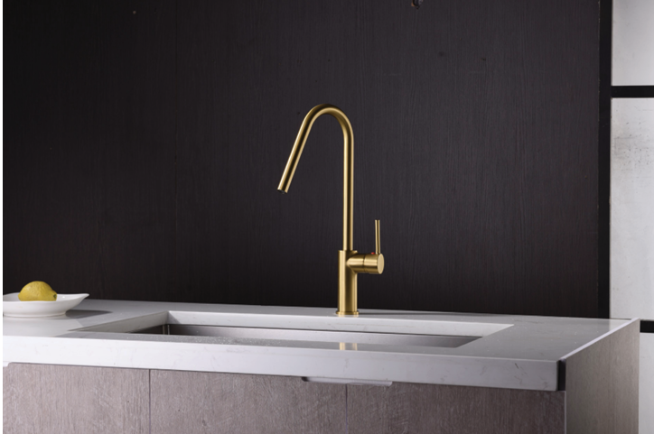 La grifería en oro cepillado es tendencia en cocinas modernas, combinando perfectamente con encimeras de piedra, madera o cuarzo, aportando un toque de diseño exclusivo.