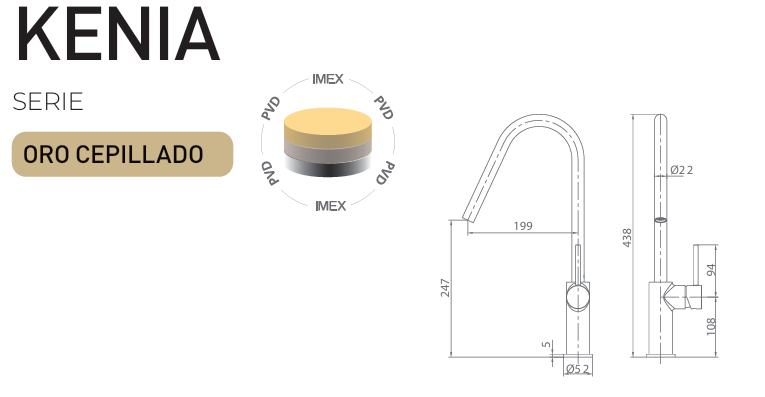 La grifería de cocina monomando IMEX serie Kenia GCE020/OC destaca por su elegante acabado oro cepillado, un diseño moderno que aporta estilo y sofisticación a cualquier cocina.