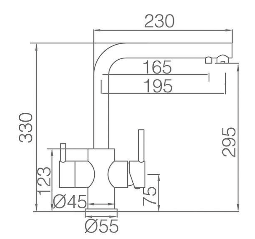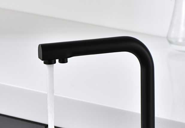 • Grifería monomando de dos vías (ósmosis) Cuerpo de grifería en latón negro mate. Cartucho cerámico de 35 mm. Flexos 50cm.