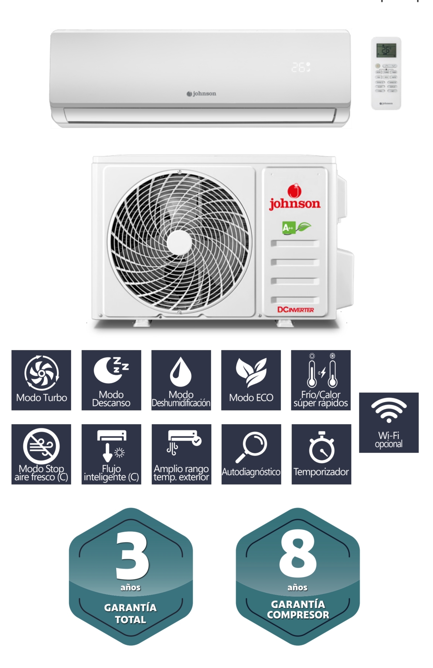Aire acondicionado Split Inverter con bomba de calor JOHNSON con una potencia de 3.000 frigorías y clasificación energética A++ además de tener función Super Silencio que baja a un nivel sonoro de sólo 21 db. en unidad interior.