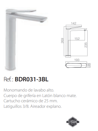 Monomando de lavabo caño alto blanco mate serie Dinamarca