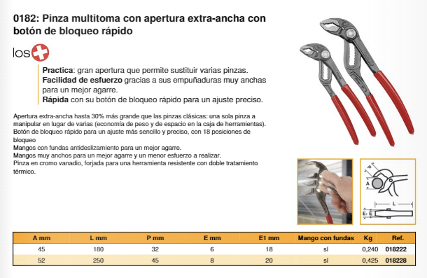• Apertura extra-ancha hasta 30% más grande que las pinzas clásicas: una sola pinza a manipular en lugar de varias (economía de peso y de espacio en la caja de herramientas).