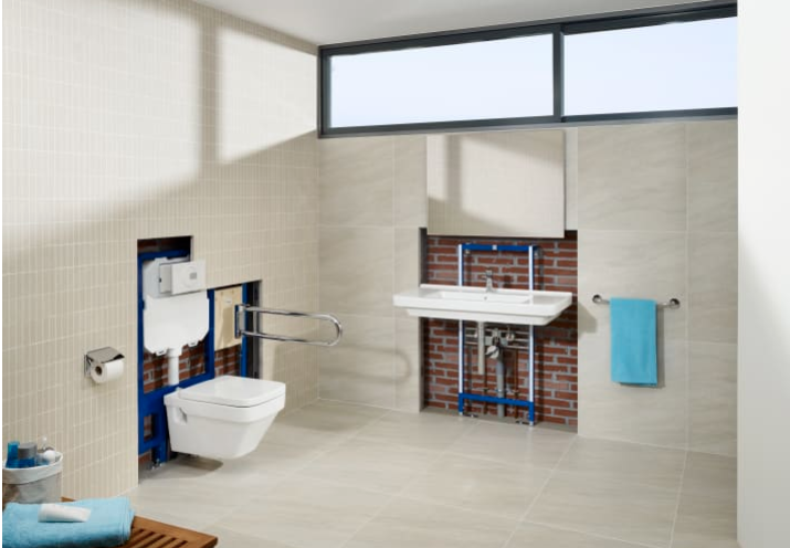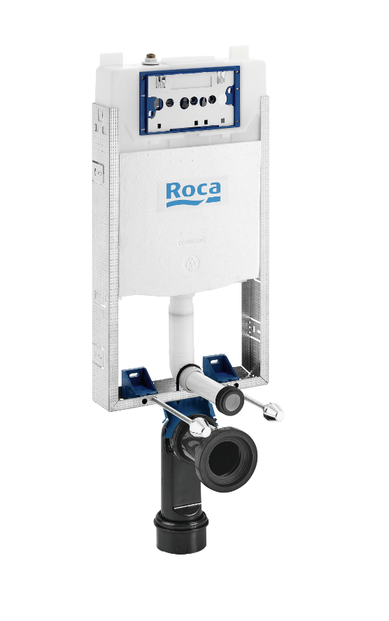 BASIC WC ONE COMPACT – Bastidor con cisterna compacta empotrable con doble descarga para inodoro suspendido, profundidad mínima de 90 mm. Codo de 90 ø / 110 ø. Distancia axial de 180 y 230mm. Conexión hidráulica superior. A completar con una placa de accionamiento Roca compatible (no incluida).