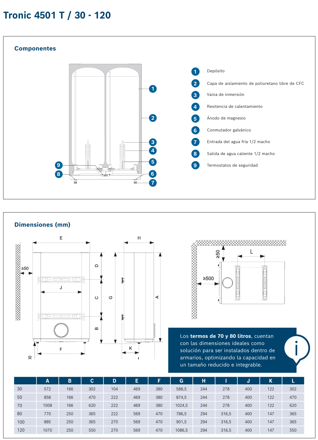Posibilidad de adaptarse a todas las necesidades del usuario gracias a su amplia gama de capacidades de 30, 50, 70, 80, 100 y 120 litros.