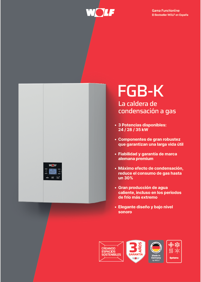 La caldera Wolf FGB K 35 es un calentador de gas para calefacción y agua caliente. Es una caldera de gas de condensación con el consiguiente ahorro de energía que eso supone. Es un aparato respetuoso con el medio ambiente ya que reduce sus emisiones de gases proveniente de la combustión.